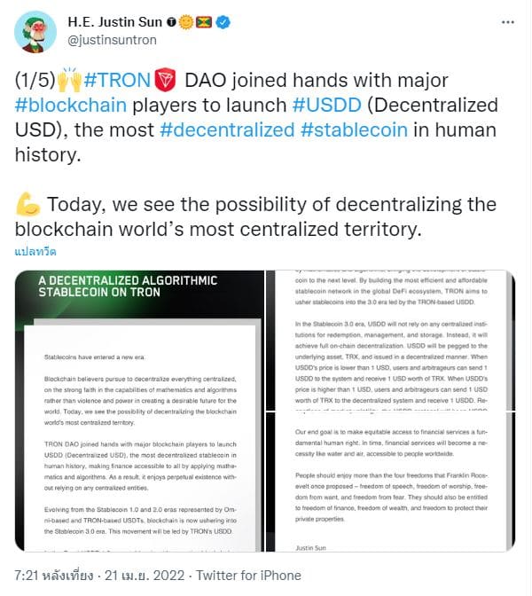 เมื่อวันพฤหัสบดี (เม.ย.) ที่ผ่านมา Justin Sun ผู้ก่อตั้ง Tron ประกาศว่า กำลังจะมี Algorithmic Stablecoin ของตัวเองที่เรียกว่า USDD โดยจะเปิดตัววันที่ 5 พ.ค. นี้!